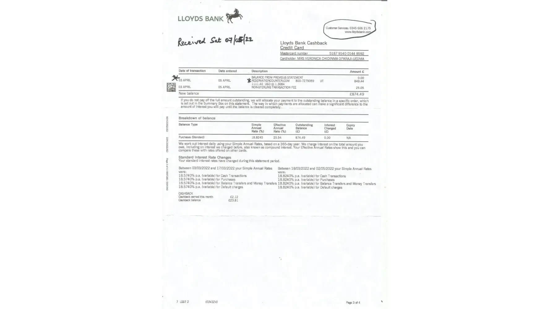 I received a credit card statement from my bank on 07/05/22 claiming that I owe them £874.49, I took no notice of it because I had paid off all my arrears. So I rang the bank yesterday to tell them that they were wrong and was told that it was for a reservation made on 03/04/22 by "reservationcounter.com" that I should contact them.