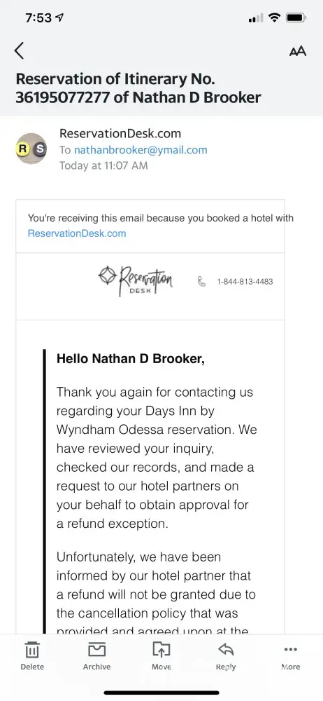 I called to book a room on 2-15-21 thought I was talking to the Days inn motel in Odessa Texas. We had been without power for over 10 hours and I asked the guy several times does the motel currently have power. It was 0 degrees here for 2 days the guy on the other end assured me the motel had power. 5 minutes after I hung up with him my wife went to check in and the motel hadn't had power for about the same time we didn't at home. I called back to your reservation desk and get told sorry we have a no cancellation policy and we will not refund your money. I've also Contacted the motel direct and informed the manager of how your services are. Today I received a email stating that I would not be getting my money back I cannot believe that your company does people this way my family and I was in dire need of a warm room and your company took advantage of that.