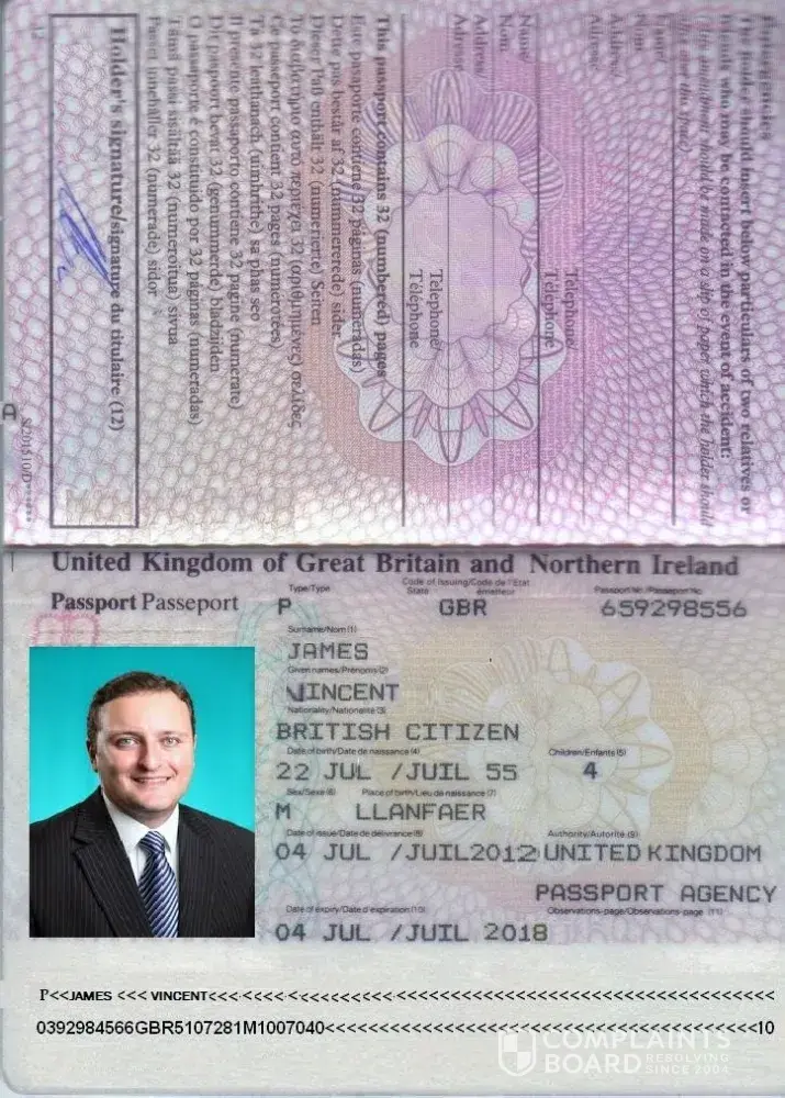 4. DIPLOMATIC PASSPORT OF MR. JAMES VINCENT FOR YOUR EASY RECOGNITION WHEN HE WILL COME TO YOUR CITY AFTER YOUR TRANSFER IS COMPLETED FROM RBI OFFICE.
