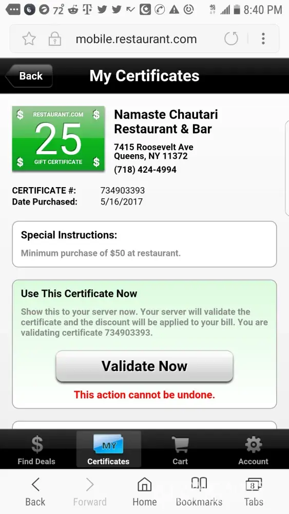 I purchased 2 certificates the restaurant will not validate.