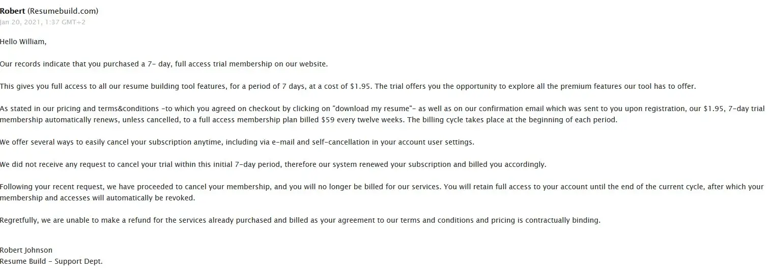 5. I spoke to few reps from resumebuild.com via email, and ended with (nicholas cohen) who told me the date I joined and date I canceled (after I requested this) as this information could not be found on their website at all. But he didn't even apologise or explain how their website offered little or no information for the end user, he just rejected my request for any refund and told me they offered no billing adjustment for the 2 days I got charged $83 aud (for not even visiting their website).