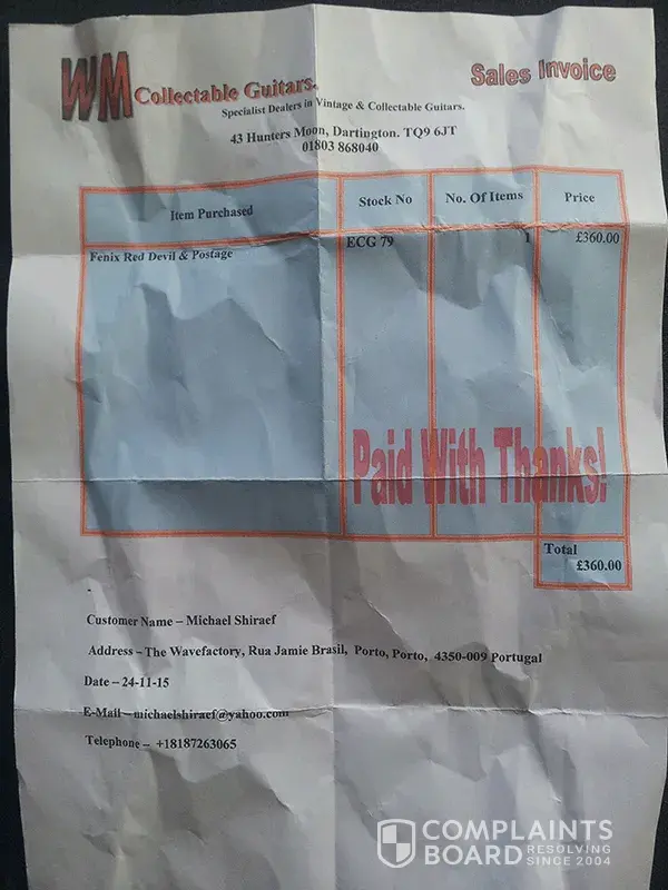 Read full complaintWmguitars.com - Guitar Purchase Online Scammer