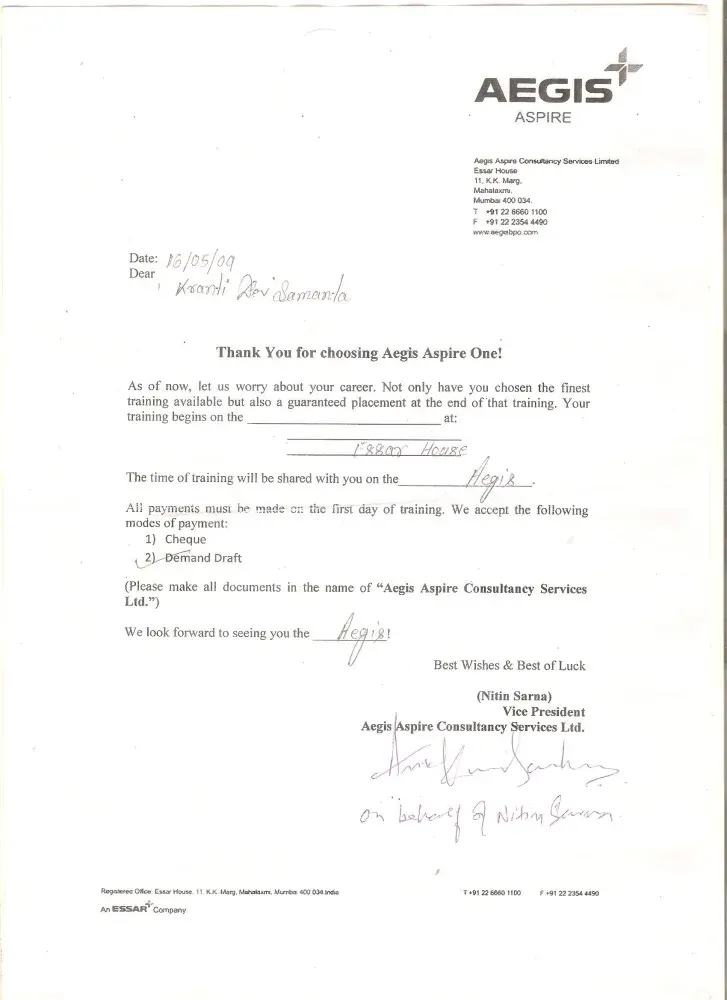 I am appointed in AEGIS after taking training in "AEGIS ASPIRE CONSULTANCY SERVICE LIMITED"