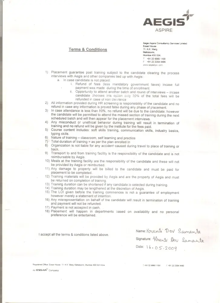 My name is KRANTI DEV SAMANTA worked for 1 year in AEGIS LIMITED at KOLKATA centre and my