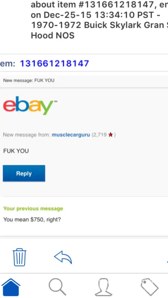 Inquired with Frank through eBay about a rough looking "brand new, NOS" GS hood listed for 7, 500, thinking it was actually supposed to be 750. His reply: