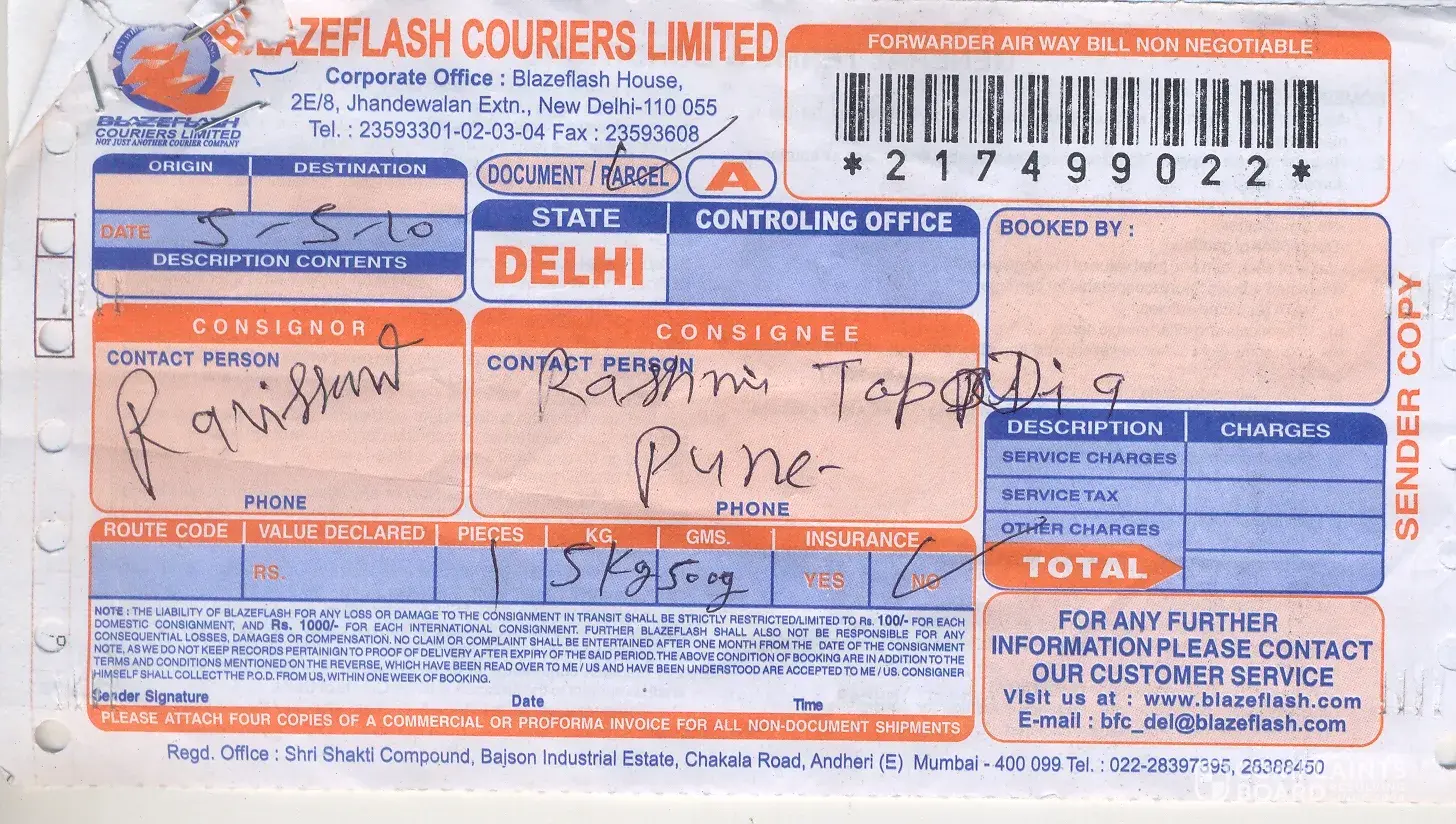 Till 15/05/2010 while Pune office kept telling receiver that train was in accident (derailed) and blah blal, Delhi office fabricated a story of parcel stolen from Railways. Neither is found to have substance.