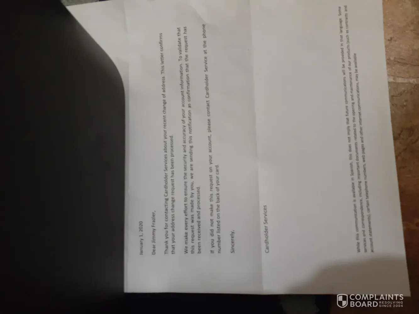 Just received a letter in the mail from card holder services on 1/11/2020 claiming a recent change of address, which I have no acknowledgement of this company and who would request a change without proper identification and how did it get processed. The letter is asking me to call a number on the back of my card with a card I'd # which is strange because they are not telling me which card .