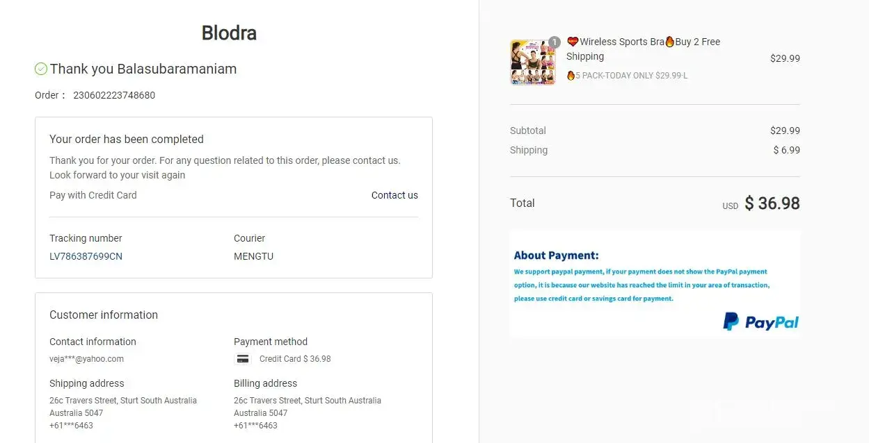 The third order was a sports bra on a website named Blodra on 3/6/2023 and delivery been stated on 27/6/2023 which is another lie!
