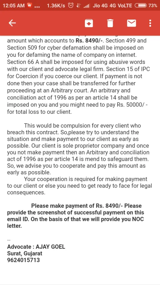 Next day after getting feared from my warning they mailed me a NOC from noc.[protected]@gmail.com mentioning that the company has received complete payment of Rs. 7600 /- from my side and I am not liable to pay anything to them.