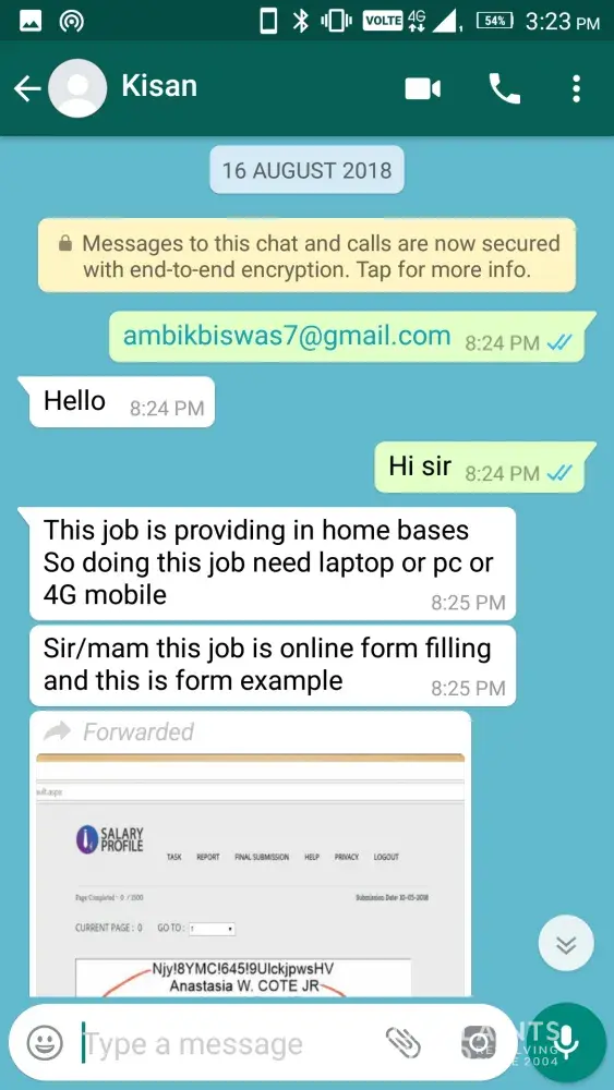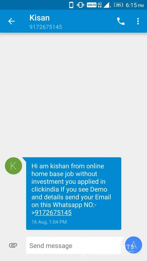 On 16th aug 2018 at 1:04 pm someone named ‘Kishan' sends me a text message . He says "Hi am Kishan from online home based job without investment (The company name was DG Services)…...send your Email on this Whatsapp No:- [protected]..