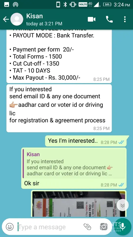 I have applied to part time form filling job through Online in DG Services company in Quikr site. I got a call from DG Services saying that if you are interested you can start doing the job. I said ok I will start doing the job. I got a mail from DG services about the license agreement and later I started doing the form filling work on September 1st, 2018. They asked me to send the scanned copy of any proof, so I sent them my Pan Card scan copy. They have given 3000 forms which I need to complete with in 15 days, cutoff forms is 2800. Deadline for completing the froms is 16th September, 2018. I have completed 1400 forms out of 3000 forms. But Due to some health issues I couldn't complete my form filling work. So I stopped doing form filling work from 12th September, 2018. After few days I got a mail from DG services saying that I need to pay money. They made many calls, but i didn't respond to their mails and calls. They have sent a text message to my phone saying if I didn't receive their calls then company will take hard actions against me. Later they called me, I lifted their call and they are demanding me to pay 7800 Rupees and said that If I didn't pay that amount I need to go to court. They have created fake license agreement using my full name. Again they sent a text message to my phone saying that "we will send you the notice Hard copy on your Residence Address. Do reply us within 2 days or call us on this number [protected] ". What should I do now? I can't pay any money as I'm from a very small family background.