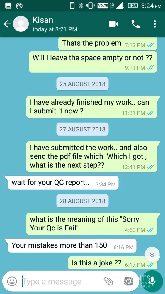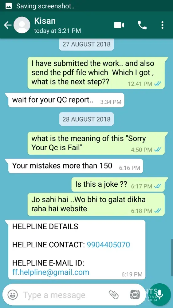 On 31st December around 9 p.m. I submitted my work after completing 3000 forms. On 1st September evening I received a text message indicating me to check my QC report after logging into the website using my user id and password. After getting logged in I saw a message appearing on my screen implying that my QC report is failed.
