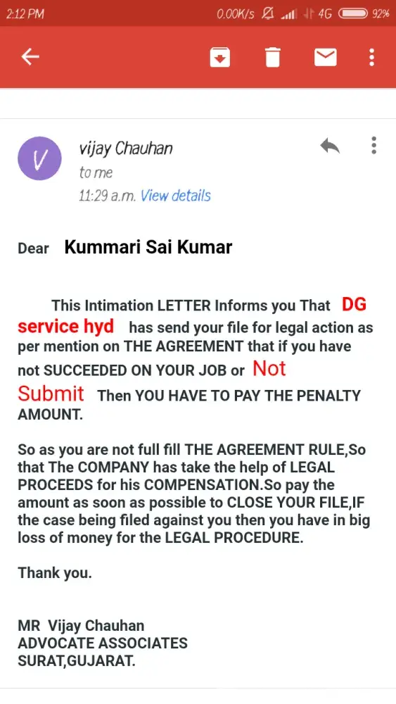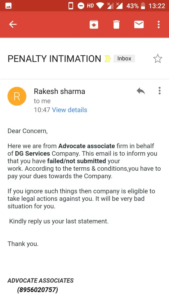 As on 3rd September 2018, I received an intimation mail from arju.[protected]@gmail.com who claimed to be the Advocate associate firm of DG Services. The mail was intimation for me to pay the dues towards the company or else they will be eligible to take legal action on me.