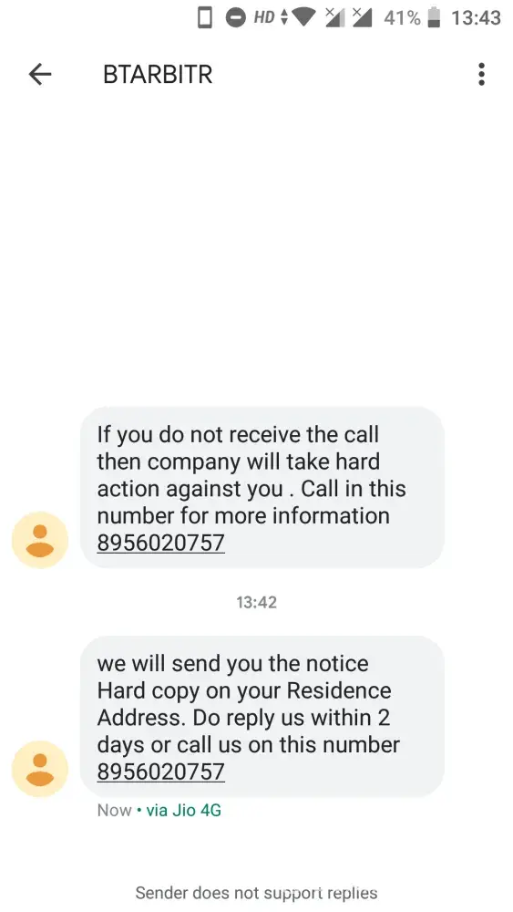 Since, I was about to appear in an interview, I made a call at the companies helpline number to request them to halt for a day so that I can be free and look into the matter peacefully, but the person directly denied saying that he can't help as the file was already handed over to the legal team.
