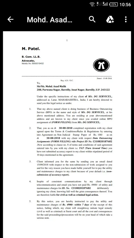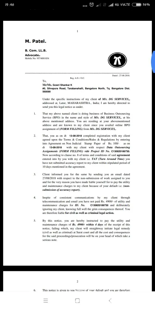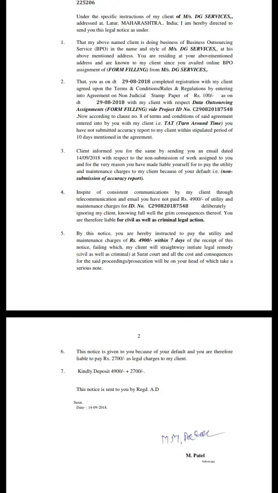 Sir a company Named DG SERVICES that is from Latur Maharastra is a form filling company and helpline email ID : ff.helpline@gmail.com and helpline contact no [protected]. One of their Employee once call me and said offering you a form filling job sent me a adder proof document and I sent him and then they made a agreement on a non Judiciary stamp of my name as second party and their own as second party. Then they sent me a user id or password and sent me a website link named workfromhomes.in with their conditions, and they assigned me 1500 forms for form filling work 10 days time, which completed within 7 days itself due to my typing speed of 50 wpm and with 98% accuracy, so I know my capability and accuracy of my job, but when I completed and submitted my work on 7th day date next day itself I got replied that your qc result are now in website when I went and checked with website I found its mentioned qc results failed, but the data which I typed and which they sent in qc results both differs and showing more errors .now they are demanding money within nest day of submission of there qc result and continuously calling, SMS to pay money and when I googled and search the details regarding this company I found lot of people already filed complaint against the above mentioned company, after that a advocate of them contact me and demand money from me . And threatened me that if I don’t give money to them then they will file a case against me . I got a mail dated on 28 /08/2018 stating we legal department DG services hereby having your case for QC Fail of work by the advocate named AJAY GOEL, Surat, Gujarat, contact no: [protected]. And threatened me that make payment of RS. 8620, provide the screenshot of successful payment on this email ID associationadvocate.legaldepart@gmail.com. On the basis of that they will provide me NOC letter and threatened me that If payment is not done then need to pay Rs. 50000 for total loss to his client. It also another advocate named M. PATEL, contact no: [protected] send me a legal notice by an email ID associateadvocate08@gmail.com on 31/08/2018 and demand money within 4 days Rs .4900 + Rs. 2500, Sir I am a student, It is not possible to give money to me. Please help me sir.