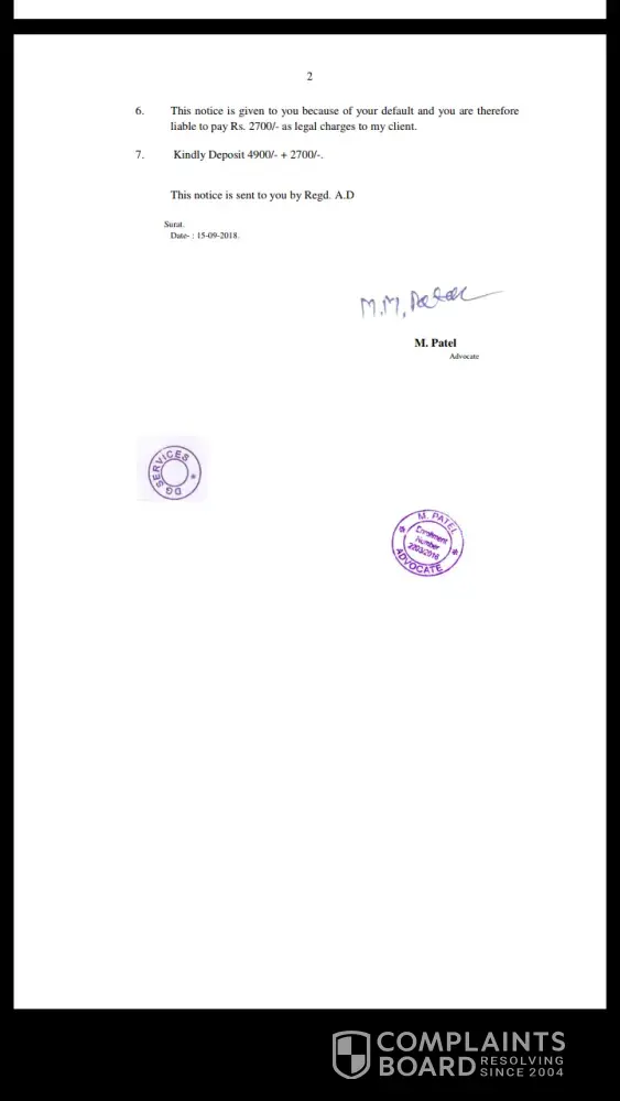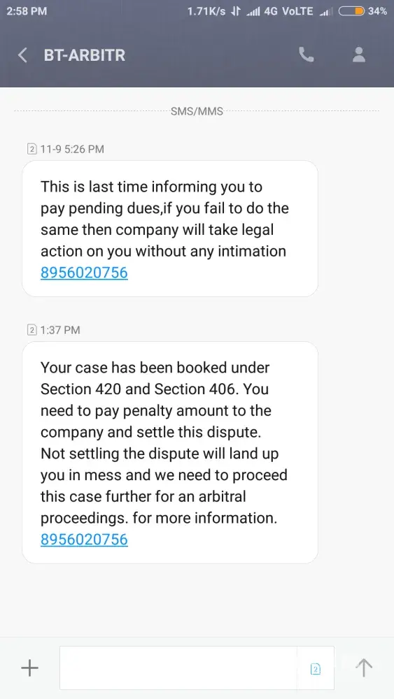 After a day the company replied me and ask for money.. Till now I neither recevd any call mail and msg from company but today a lawyer msg me and mail me and he demands money and give threats of legal procedure.