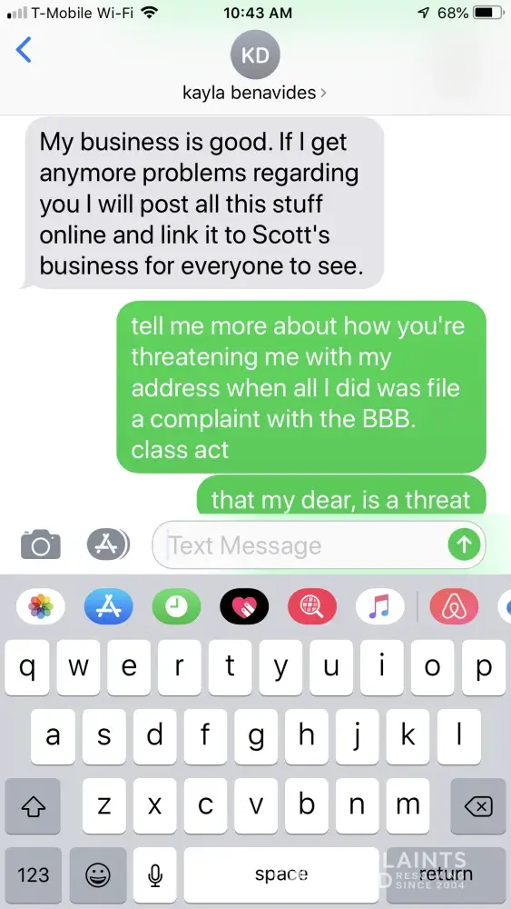 the steps taken by this company were an onslaught of slander, of which will be used in a civil lawsuit. Please remove the complaints as we are being threatened and harassed by owner, Kayla Benavides.