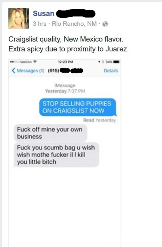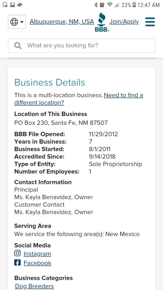 The person behind the screen is Susan Etta Barber age 50. She is the girlfriend to one of my former customers Scott Jones. More simply put she is not a customer of mine. I can't even believe I'm entertaining this review but you know what this type of story needs to be heard by anyone that comes across this review. So in 2016 I get a call from Susan Barber to chat about available puppies. She then goes on to waste hours of my time just to end up buying a cheaper dog from another breeder. I actually know who the breeder is and will not mention her name out of respect. She also had posts about the breeder on her social media saying that the dog she got from the lady had foreign objects in it's stomach and she was going broke taking it to the vet. She later removed those posts from her social media after Scott purchased a dog from me and I later confronted her about it when she started giving me problems. Keep in mind, around this time a competitor of mine decided to slander me online. My domain search was actually clean until that happened so this why you see Susan here following in my competitors footsteps because she is not a customer Scott was. Therefore, the BBB won't entertain her lies. Anyway, after her 1st initial contact in 2016 Scott waits 2 years to buy a puppy from me. During these 2 years Susan is following me on social media & Scott would message me off and on to inquire about available puppies. Eventually I get a call in June of 2018 from Scott Jones wanting to see a puppy I had available. While talking to him he expressed he had 2 bull terriers one a rescue and another from a breeder I mentioned earlier in this discussion. He also made in clear he was very experienced with the breed. While on the phone with him arranging the purchase, Susan is in the background yelling, " PUT HER ON SPEAKER PHONE I WANT TO HEAR WHAT YOU GUYS ARE TALKING ABOUT" her voice was not calm and polite when she said it either. She yelled it in a jealous dominating tone. This immediately should of been a red flag to me and I should of terminated the phone call right then and there. I will admit in the past I liked the challenge of these type of customers and would take them on simply to prove a point & when they had mentioned they were a little doubtful because they had ran into the forum my competitor wrote I kinda felt obligated to prove their doubts about me wrong. Anyways, Scott decided to buy the dog after continuing to low ball me in past inquiries through social media. He then invites me to his property in Rio Rancho NM. I get to the property & at that point was rudley greeted by Susan. She said nothing when greeting me instead she had this bitter look on her face. Also while I was at Scotts and Susan's place. They both drilled me with temperament questions the whole time. This confused me because as mentioned before they owned 2 bull terriers at the time. After answering numerous temperament questions, which my responses were not sugar coated, Scott then walks around aliasing the puppy while susan begs him to give me the money like some sort of child. He then tells her to " hold on it's in my pocket." At that point that's when I knew she was in fact not paying for the puppy. He then handed her the money to give to me. While counting the money, Susan is making side remarks that the puppy looked like a chihuahua. Again at his point I should of terminated the sale but nope. Again, I no longer deal with people like this anymore. People that belittle me in anyway will be asked to GO FIND ANOTHER BREEDER. Furthermore, the sale was later completed and I left. Not even 2 days later after selling the puppy Susan comments on one of my social media posts that the customer getting a dog shipped to Atlanta should, "come pickup the puppy instead." She also made sure to write the comment in all CAPITAL LETTERS too. I then blocked her from my social media. I also think it's rude when customers try to micromanage by business and I have found nothing good ever comes from these type of clients but extreme entitlement. Susan then emails me at 4am a week or so later saying " we need to talk. why did you block me off of social media?" I then ignored that email. I then get a call 8 months later while I had a litter of puppies from a lady by the Kathy Finley saying Scott had referred her to me because him and Susan were impressed with the quality of my puppies. I then sold to Kathy and she has not contacted me ever since with any issues. Days after Kathy took home her puppy, I get another email from Susan saying the puppy had aggestion issues, she wanted nothing from me, and wanted to keep the dog because she supposedly had it in training. She then goes on to demand how she wants me to stop breeding and has screenshotted all the siblings to her puppy from my social media. I then contacted Scott immediately but my text messages and calls went unreturned. I called Scott and not her because she was obviously not the one that paid for the puppy. So her allegations stated in this review that her attempts were disregarded is a lie. In fact, I had just texted scott days prior asking him how the puppy was and thanking him for the customer referral. Please reference the screenshot for proof. She then went ghost on me for 6 months until I got another email from her asking if a bull terrier she found was possibly mine. I then chuckled while reading the email and ignored it. It is now currently July 2019 and I get a notification from the BBB saying a customer left a review. I then go check my account and sure enough it's the devil herself Susan Barber. She left a review not a complaint 1year after Scott bought the dog saying I was unethical for not standing behind my aggressive breed. That review was never posted because the BBB found out she indeed was a lier. I knew I did nothing wrong to this women so I warned her that if the bbb decided to post the review I was going to do the same to Scott's business. I actually contacted sc