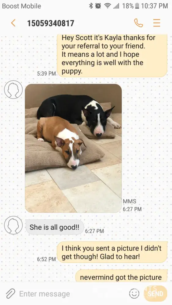 The red and white female is the bull terrier I sold scott. As you can see in the pictures, the dog's are together & they also have not provided proof showing the certificates of completion for the dog training they claim the dog got. Please post all documents on here Susan since you like to accuse me. I don't see scott writing this review. It's you that has hate for me.