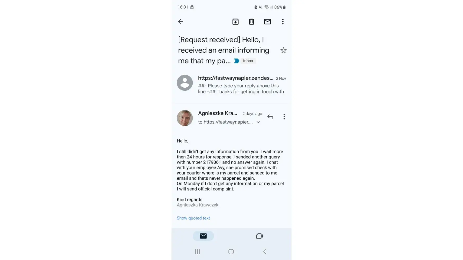 Desired outcome: I wish get my parcel or refund.
