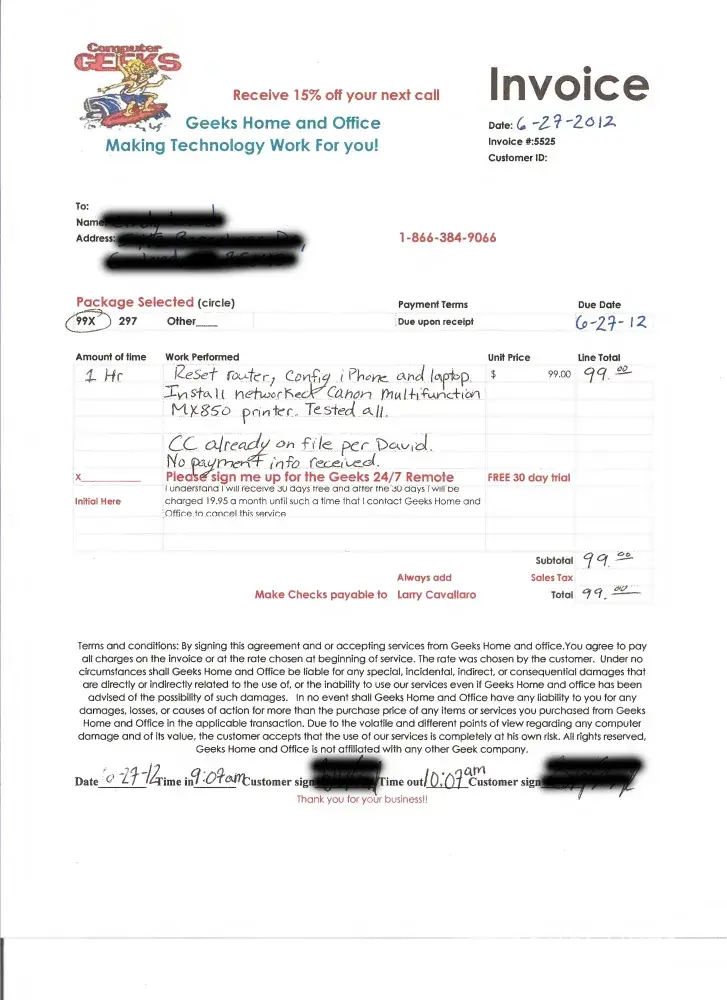 *** You agree that Geeks Home and Office cannot be held responsible for any problems that arise due to failure to call us with critical information ***