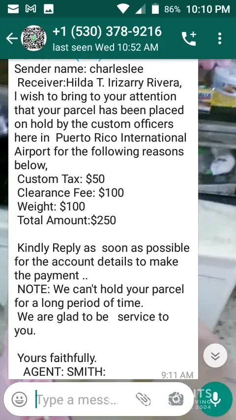 Hi, I'm Ms.Chong. Yesterday your company fast links send messages to me my package already at Malaysia but I want to clear the service tax to them just can sending the package for me. I want know this is true or not? This package from my Houston, Texas net.friend sending to me. (Name : faridah hanom binti ramli ... Acc no cimb : [protected].. Charges for...