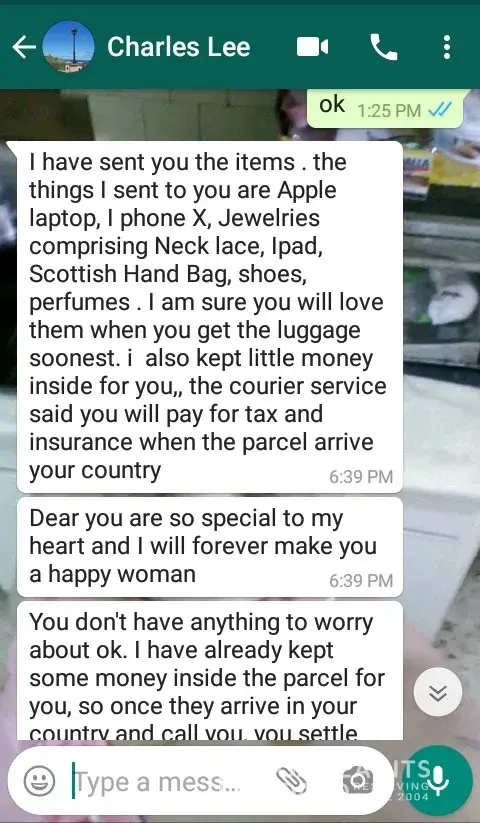 Check it out. I just found a new friend on the internet a few days ago. He talked a lot and said he wants to give me something and he also sent a lot of pictures and his agent came to my country and called me and said I have to pay some amount to clear the customs and as soon as I get my parcel when I feel this fraud