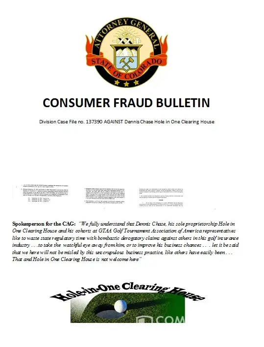 Besides NOT Paying for a legitimate Hole in One . . .Dennis Chase Hole in One Clearing House has a history of foul up non payments $200k Chicago $50K Denver. Now teams up with GTAA Golf Tournament Association of America Arizona . . . my personal business dealings was that he absconded with ALMOST ALL a company start up funds that I got involved with AND Stole dedicated funds for a dealership. This company dissolved within 60 days due to Hole in One Clearing house Dennis Chase misappropriating the monies Do not get involved with these companies AND Associates of
