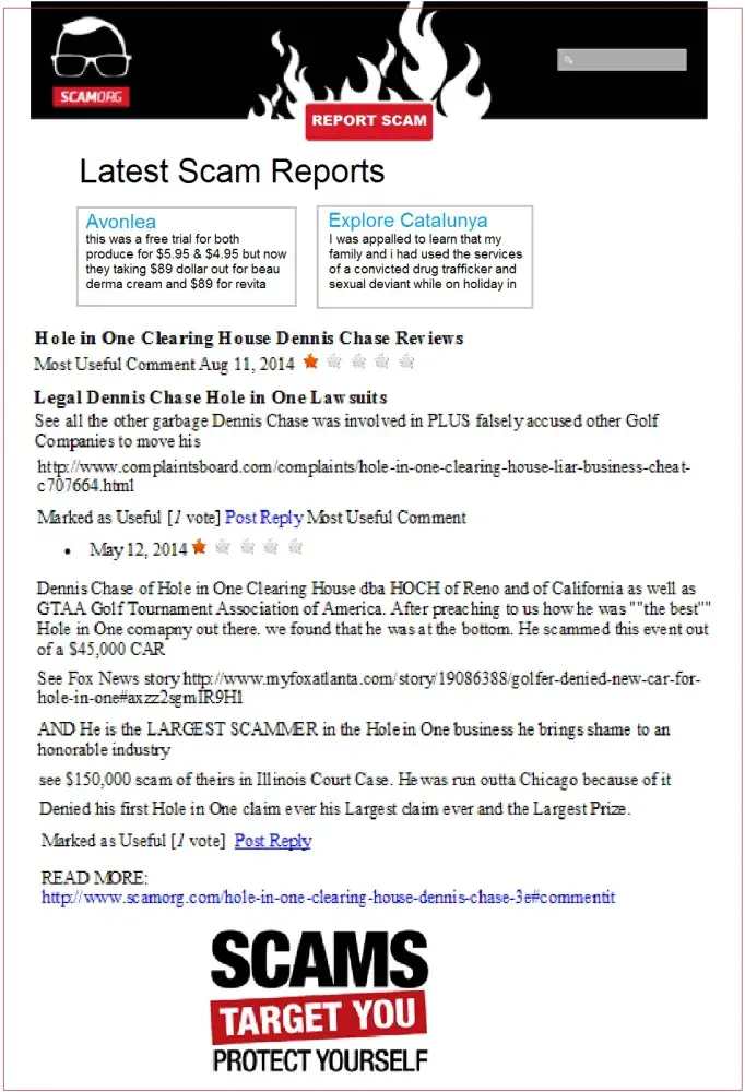 Hole in One Clearing House reviews all over the Internet are deplorable. Do Not get involved with his associates GTAA Golf Tournament Association of America Leader board and many others. Dennis Chase Owner Works out of a PO Box in another state