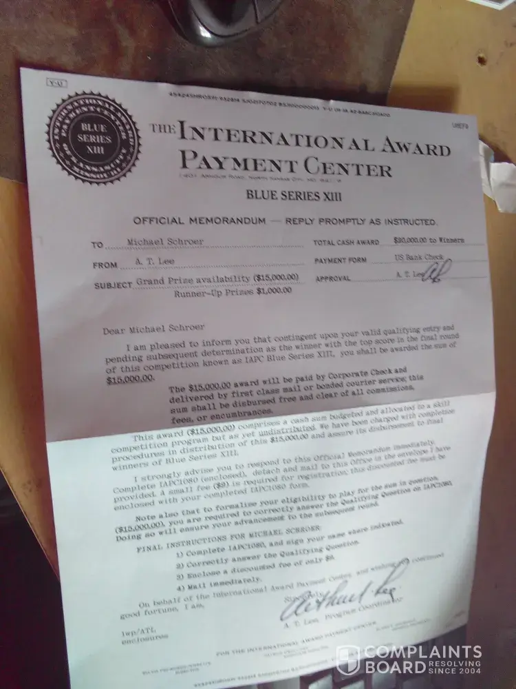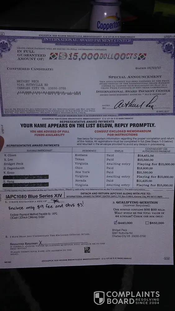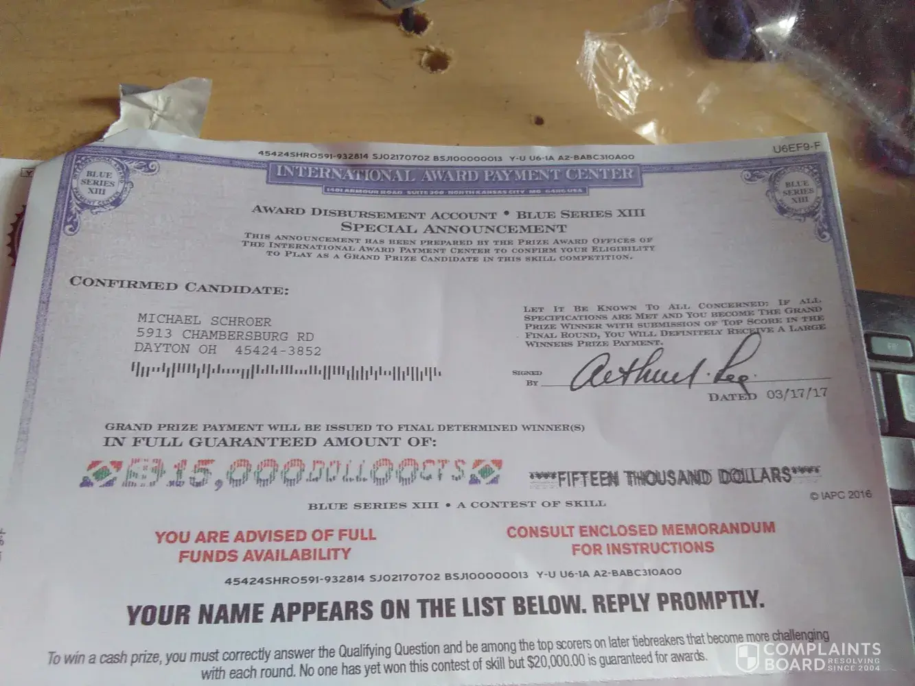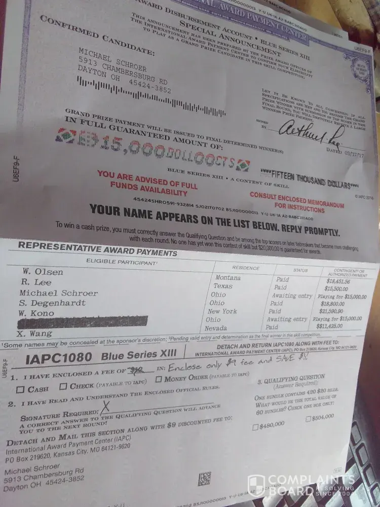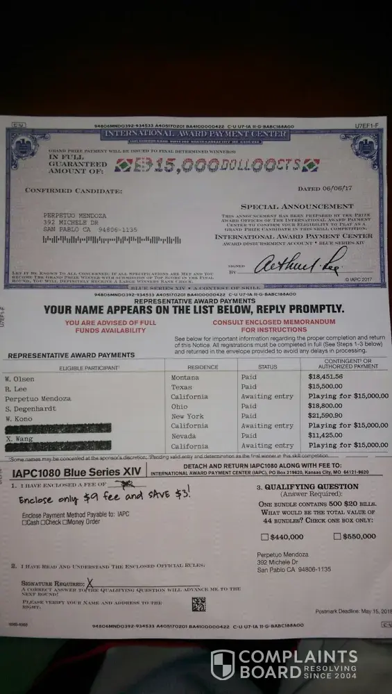 Yup so do I folks. 'Just receive a letter from IAPC dated June 6, 2016. It's dressed up as a skill competition program asking me to answer a simple math problem. It's so simple that you don't even need a calculator to get the correct answer. It is asking for a measly registration fee $9 ($3 discounted) as one of the requirements. If I answer the problem correctly, I will be now moving to the 2nd round then I wouldn't be surprise if it will ask for a much bigger fee. I was so suspicious that I googled up this firm's name only to find tons of scam reports. I wouldn't be surprise if someday (hopefully sooner), the FBI will come knocking at its door.
