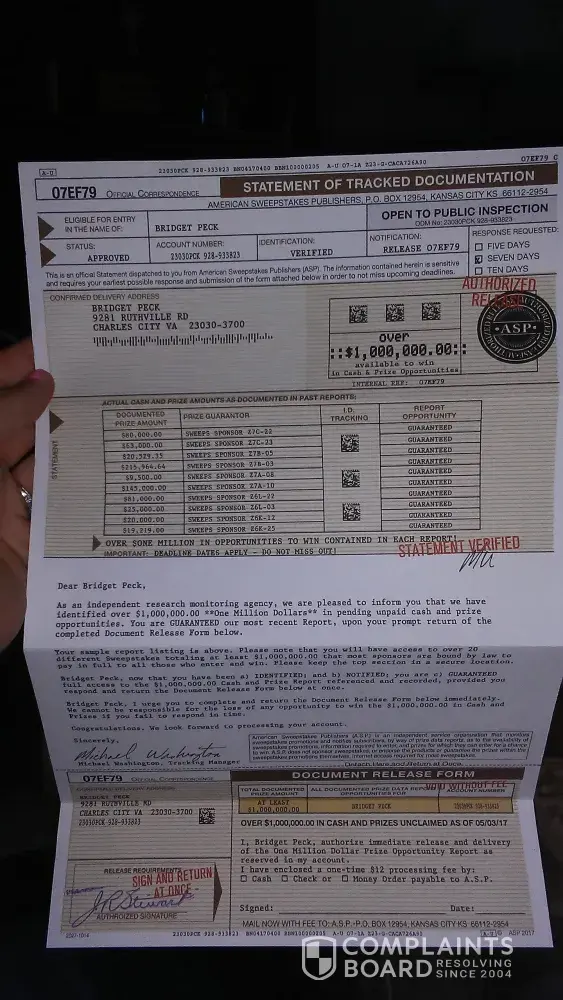 i am from maine and they sent me a letter stating that i won 15, 000 dollars, and want me to send 9 dollars. i am glad i went online to check them out before i did such a thing. thanks everyone for your comments it really changed my mind. the same company is american sweepstakes publishers. said i won 1, 000, 000 dollars, i also checked online and they wanted 12 dollars. they must be the same company.
