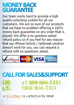 I wished to unlock my iPhone to use it with another cell phone service provider but was taken in by this online scam. The instructions did not include my iphone version. The home page says their instructions will work but once you pay, there are no instructions on what to do next if there is a problem with the iPhone version. "100% money back guarantee on any order that is placed." on the website homepage is a fake. The "sales & support" phone lines don't work. I'm out my money. I ended up going to a man who advertised locally on Craigslist to help me and he fixed the phone in a few minutes.