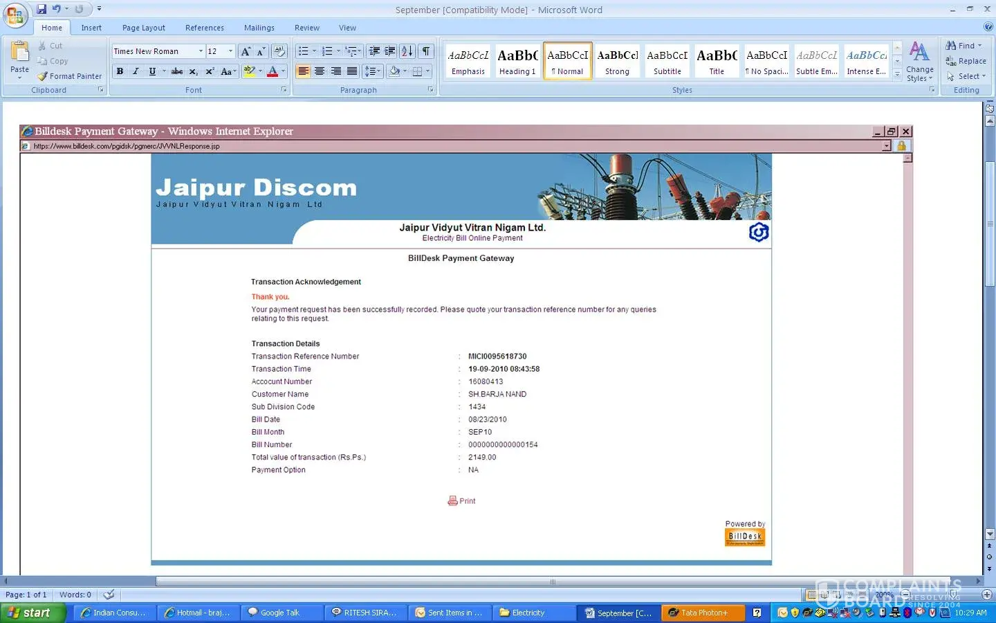 bill payment of JVVNL amount Rs. 4, 774/- payment through PATM & the same payment showing successful receipt no. [protected]