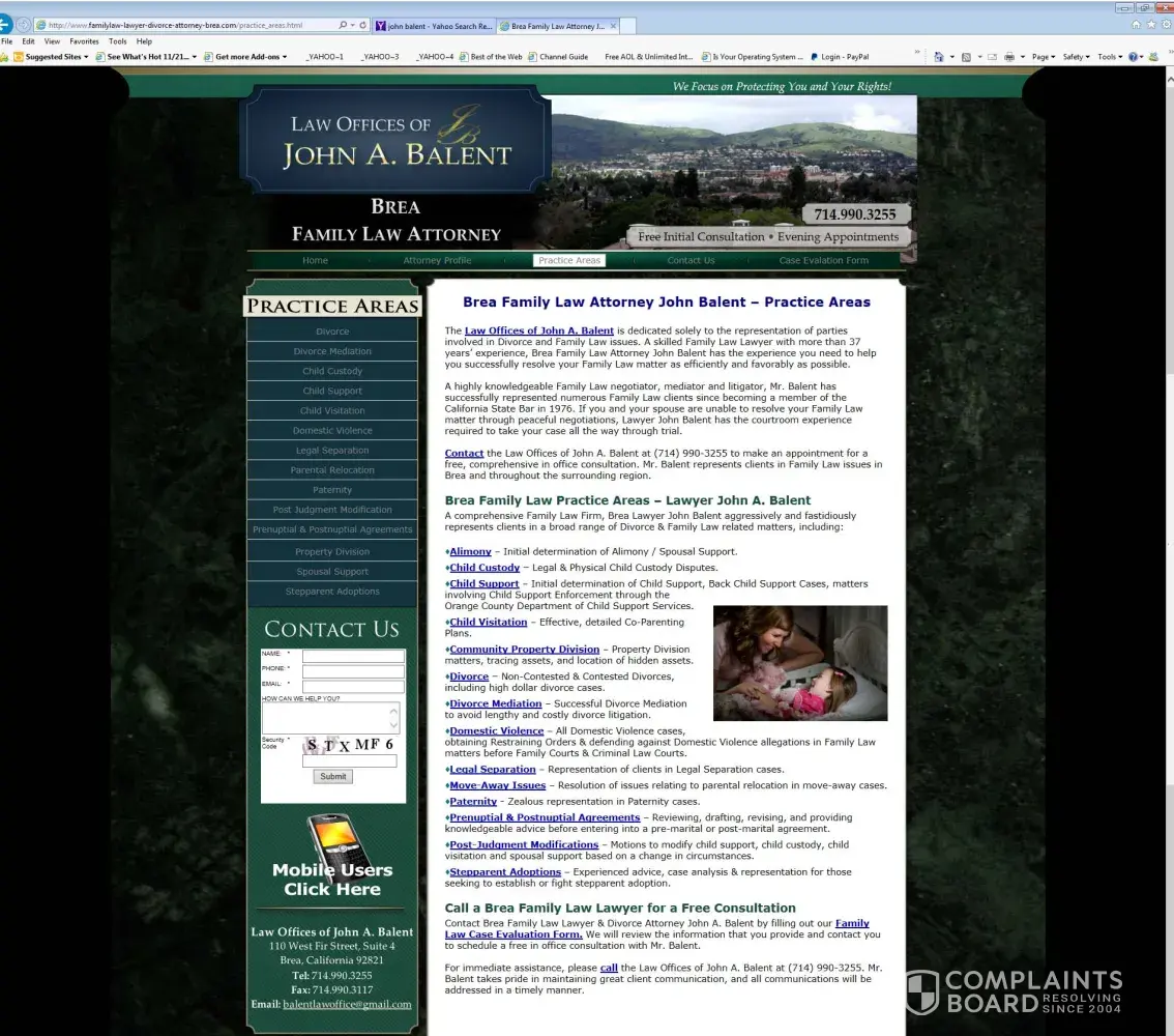 Attorney John A. Balent False advertises to gain employment from Prospective Clients. His website claims (in the upper righthand corner) that his practice is "Dedicated Exclusively to Family Law Since 1976" but he actually has been involved in non-family law cases dating back to 1983 according to public records. An obviously angry client has also posted his record of Malpractice Suits, Civil Suits, Judicial Sanctions, Fee Arbitrations and an unsavory practice of lump billing his services to avoid accountability to his clients. That website can be found at www.bewareofjohnbalent.com