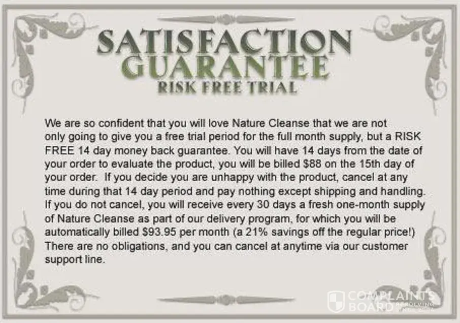 Placed order for trial bottle of nature cleanse for $4.95 S & H only. After product was received I called to cancel and was advised my credit card had already been charged $89.00 for the next shipment and was not refundable. The customer service rep was rude and unprofessional. This is a total scam. I wish I had read the complaints before ordering.