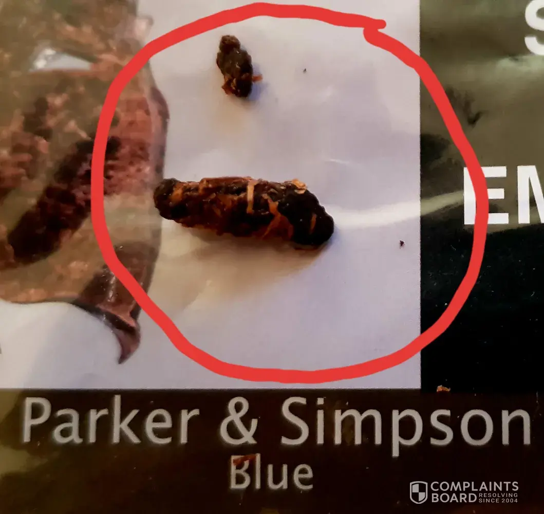 Every pouch I've purchased has had black, tar like clumps strewn through out that resemble rat poo. Pictured is one of the biggest clumps I've come across. If the price of smokes goes up, then so should the quality and that's surely not the case here. Parker and Simpson are coming off as a greedy profit hungry company that doesn't care about it's customers, customers who they would be nothing with out.