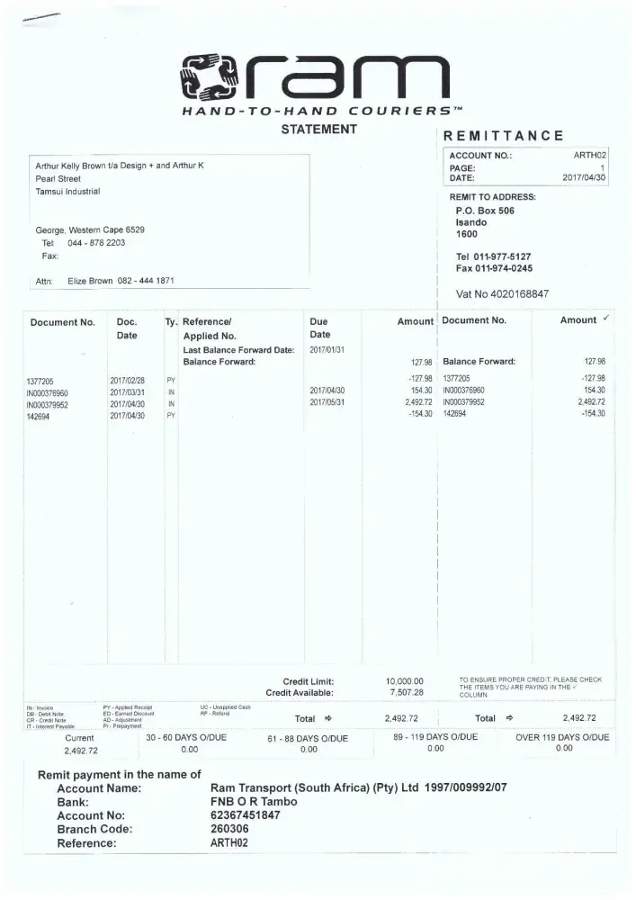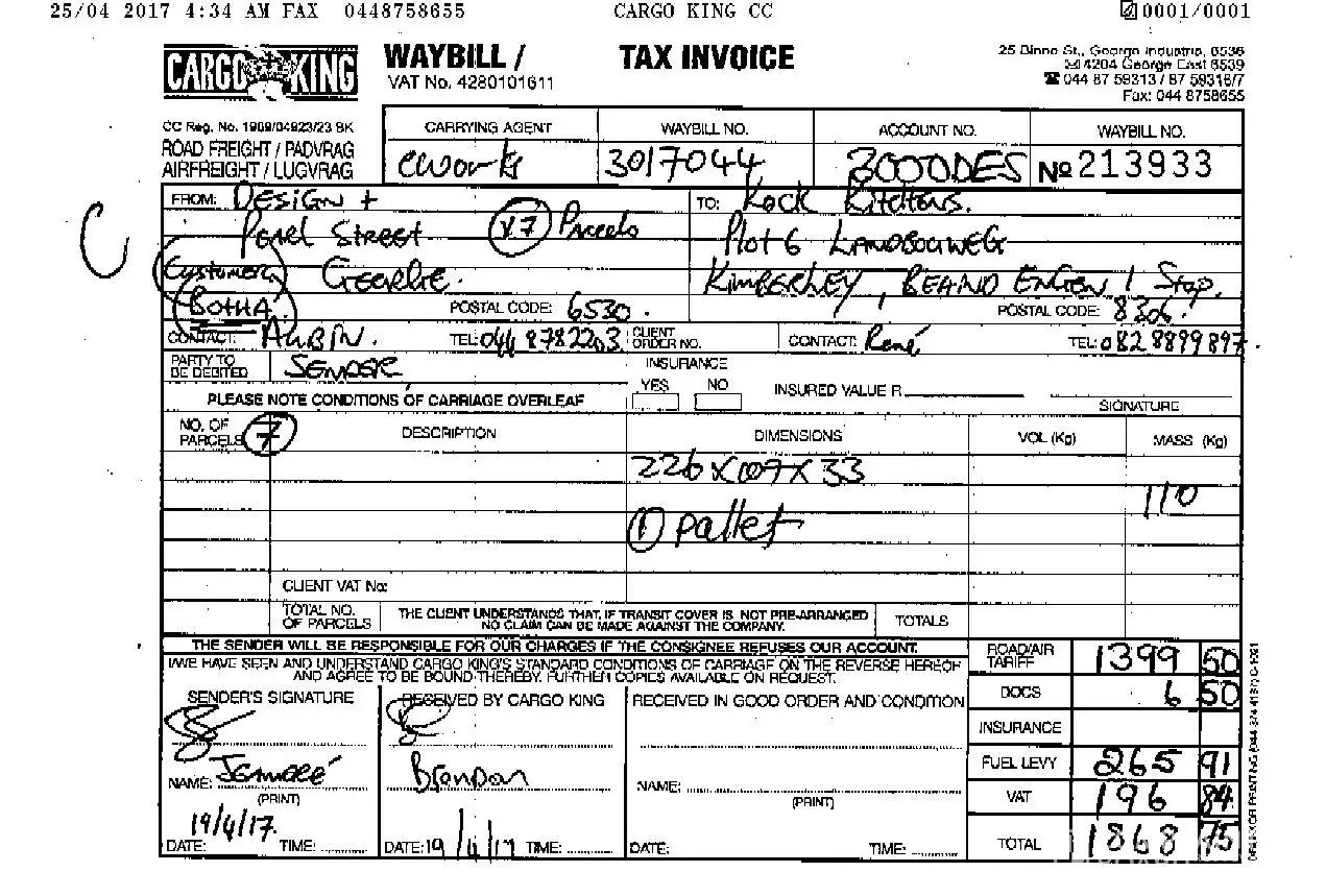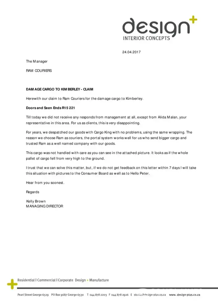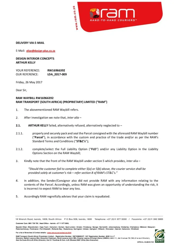 We as a small business company made use of Ram Couriers as our transport company. In March, this year they transport doors and panels to a Kitchen Company in Kimberly which we have supplied for several years. When they delivered the doors and panels it was severely damaged. If you look at the photo’s attached you can clearly see the cargo was not handled...