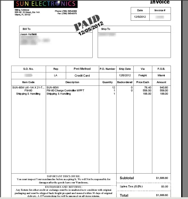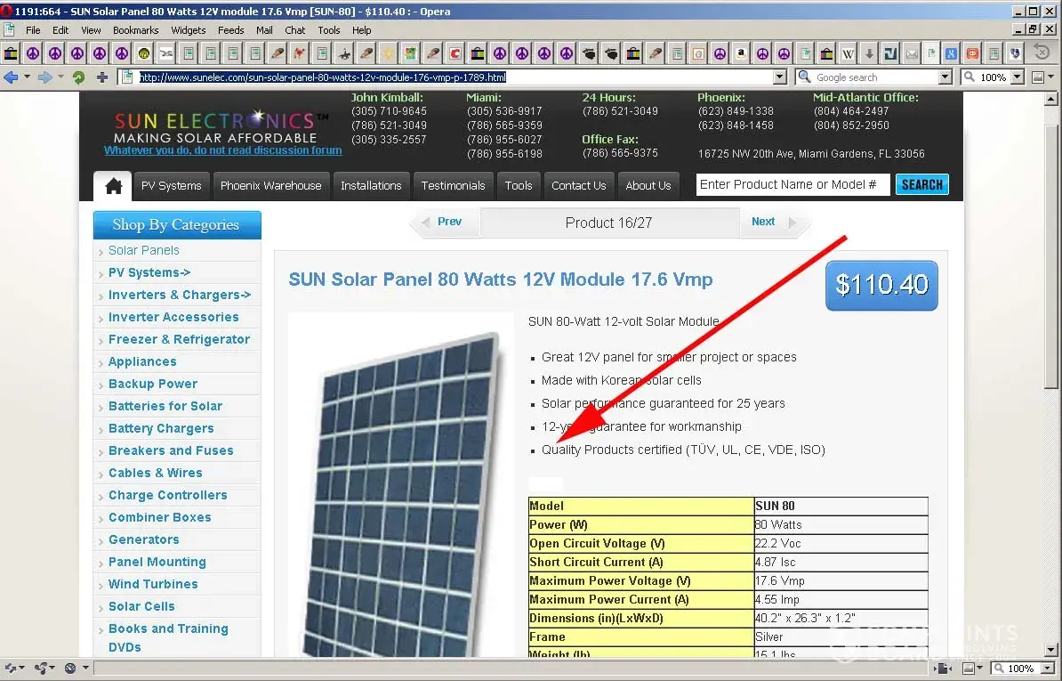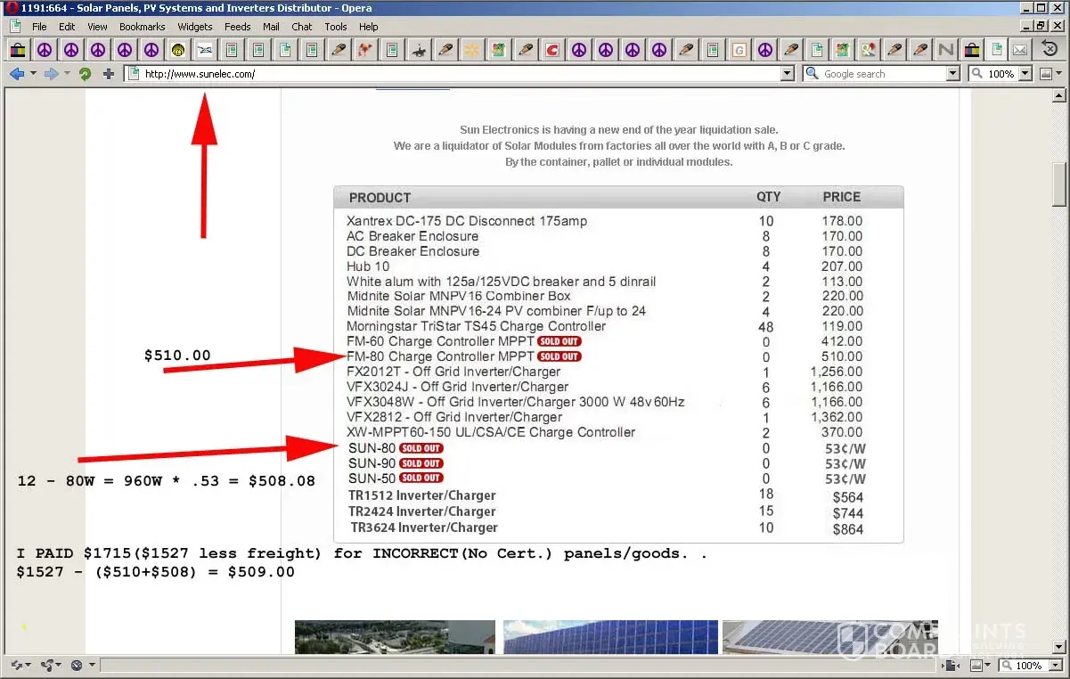 Long winded in details, but basically Ordered $1695(?) worth of 12 Sun-85 Panels, and an OutBack FM-80 Charge controller, $188 freight(2hrs away). I verified over the phone TWICE the specifications and size, and we even waited a day so someone could check the panels 'in the warehouse'. The panels listed as very well certified "Quality Products certified (TÜV, UL, CE, VDE, ISO)" were actually not certified at all, and the size was wrong on 1 side(so if someone did check, they didn't check both). Now I was paying for 'certified panels' at $0.98/Watt, to which there are 4 or more other 'brand name' panels I could have bought that 'defiantly were' but given sunelecs longevity, I thought their warranty was as good as another so ordered these. Panels arrived in-tacked, charge controller arrived missing manuals in a 'patched up' quite broken/dented in box.
