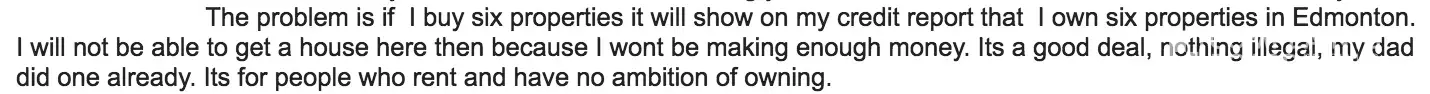 Gareth Adrian Poole in Oakville, Canada, tries to bring people on board for a mortgage scam done by Sunny Talwar from Edmonton, Canada. Gareth and Sunny get you to use your available credit in credit to buy some properties. According to Gareth, "it's a good deal, nothing illegal, " and "my dad did one already. It's for people who rent and have no ambition...