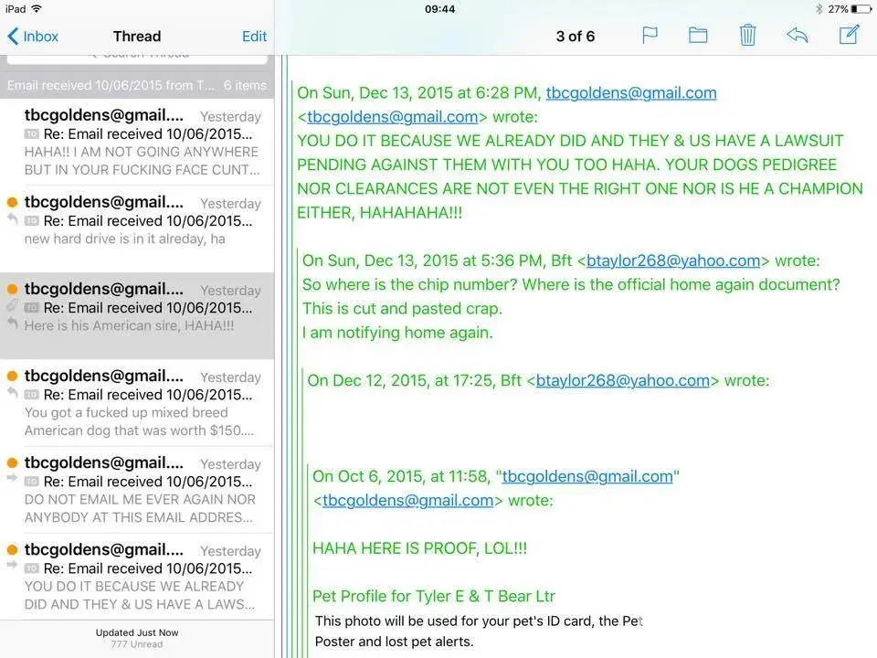 These are screenshots of some of the emails, admission of fraud sent to me by this breeder two days ago. The picture of my dog