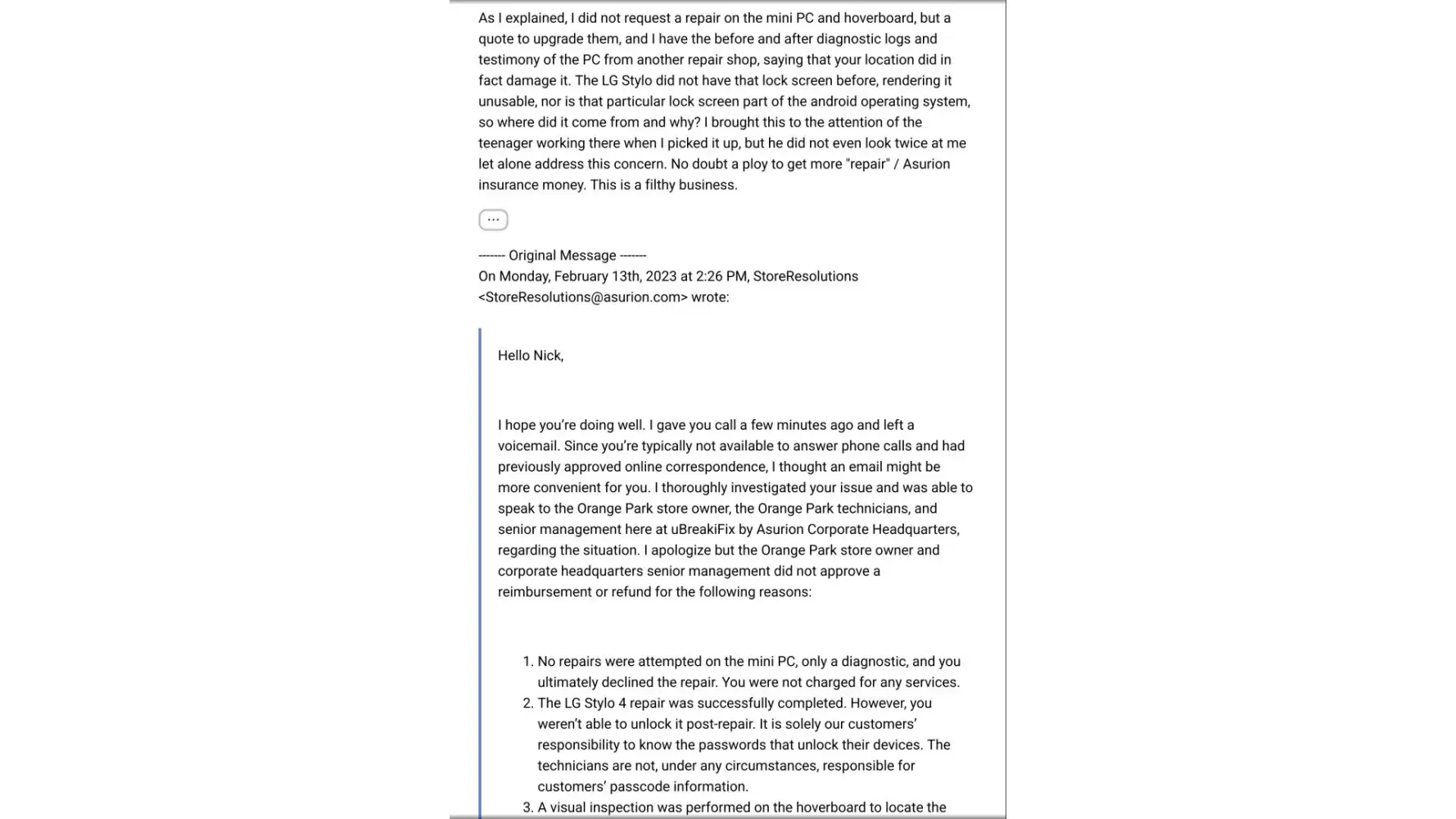I immediately called Daniel and got him on the phone with Logan. Daniel told him that he had to give me back my phone and that the company (Asurion) had already issued my damages check as of the 15th. Logan still refused the directions from this corporate representative and said that the franchisee left him instructions not to release the phone without first collecting money from me for it. Essentially, I would be buying back my own phone which they themselves destroyed. Daniel then said to Logan that he would talk with the franchisee about this and told me to stay on the line.