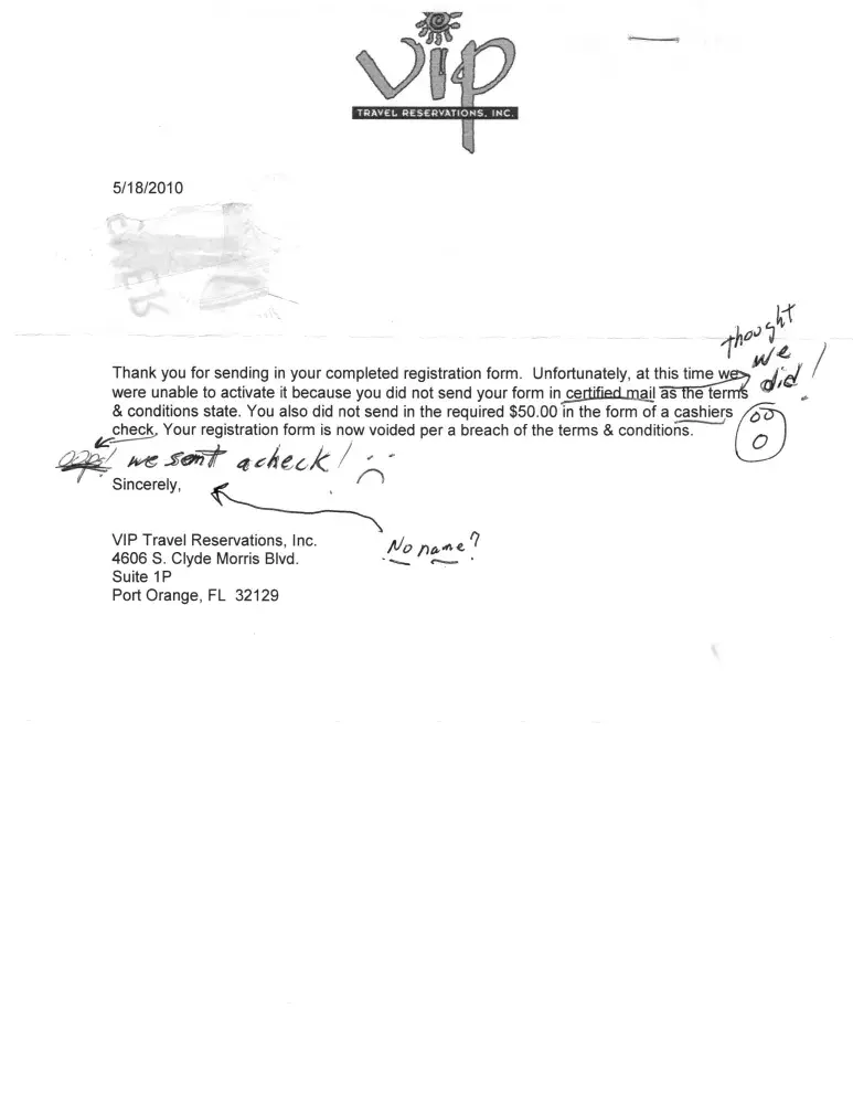 I do apologize that you feel the way you do, however, I would like to say that it would be impossible, especially in your case, for VIP's "very financial existence to depend upon "returnable fees" they collect by default, when an unwary consumer doesn't pay (in excrutional detail) ones complete attention in executing a myriad of specific complex instructions, " because we returned the money you sent exactly how you sent it to us, also spending $.44 to do so and not receiving anything as you did not follow the terms and conditions (not sure what excrutional means). Anyhow, I did pull up where we scan all of your paperwork into your file and see where, no, in fact your certificate was not sent in by certified mail per the first sentence of #1 of the terms and conditions, but also you sent a personal check (also #1). Unfortunately we are unable to accept personal checks any longer as more often then not personal checks are returned NSF and then our bank charges us a $35 returned check fee, very similar to why many businesses will no longer accept personal checks, they are simply, unreliable. I do have copies of your envelope showing they are not certified mail, as well as copies of all your terms and conditions and other information if you would like me to forward that to you, I didn't feel it appropriate to post it here. I did however, just receive an email from your wife as well and will respond to that shortly. I will probably also follow up with a phone call. Hope this helps clear up any confusion, and you have a nice holiday weekend.