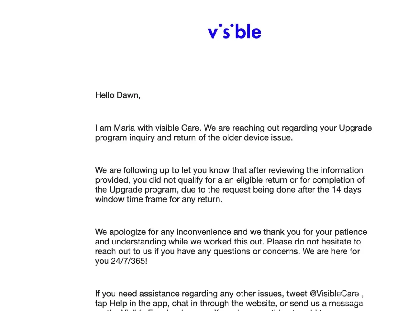 I was talking to a customer service rep on chat while I upgraded my phone. I followed the directions they gave me and placed the order. I received the phone quickly and was able to transfer the service onto the new phone. It occurred to me that my old phone was still sitting on my desk several weeks later. I have been traveling every single week with my job and offered proof to Visible. Since I didn't reach out to them until 3 weeks after the upgrade date, they will not honor the upgrade and send the return information. I have spoken to Affirm and they assure me that they are simply the company that provides the financing and nothing more. Visible tells me that since I didn't turn it in within 2 weeks that I am out of luck. At this point, I have 2 loans with Affirm and am stuck.