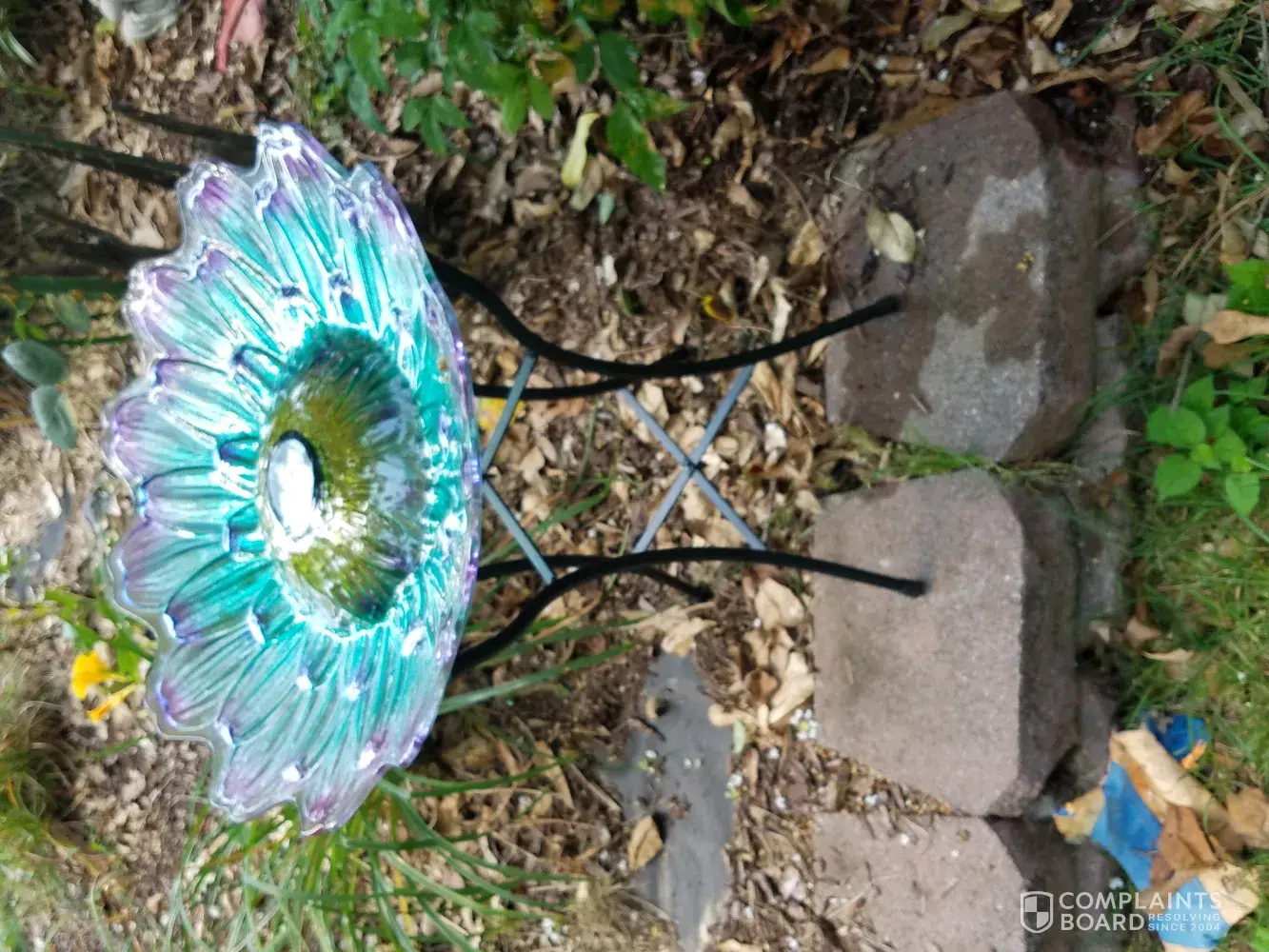I purchased a floral solar bird bath on sunday july 1 2018. I got it home and removed it from the box and found it was missing the solar light that fits in the middle of the bird bath