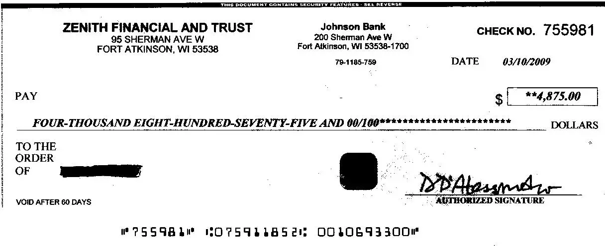 I received a check from zenith financial and trust in the amount of $4875.00 instructing me to sent tax money to a tax agent. First you do not send money to a tax agent you send it to the irs whether state or federal secondly if you know checking the numbers at the bottom for the account are too many and the check number was not included at the end. And thirdly you do not send tax payments by western union there has to be a form included with the payment national or internationally. So when it instructed me to send the amounts I let them talk and when I asked how do I know if this is legitimate larry benson (so called) hung up. This tells me they are not only using false accounts but false names as well. Remember this and if you get a check call your local fbi or law enforcement agency before you call them and put it on three-way and maybe they can trace the call. Go along with them to give the athoruities time to make the trace.