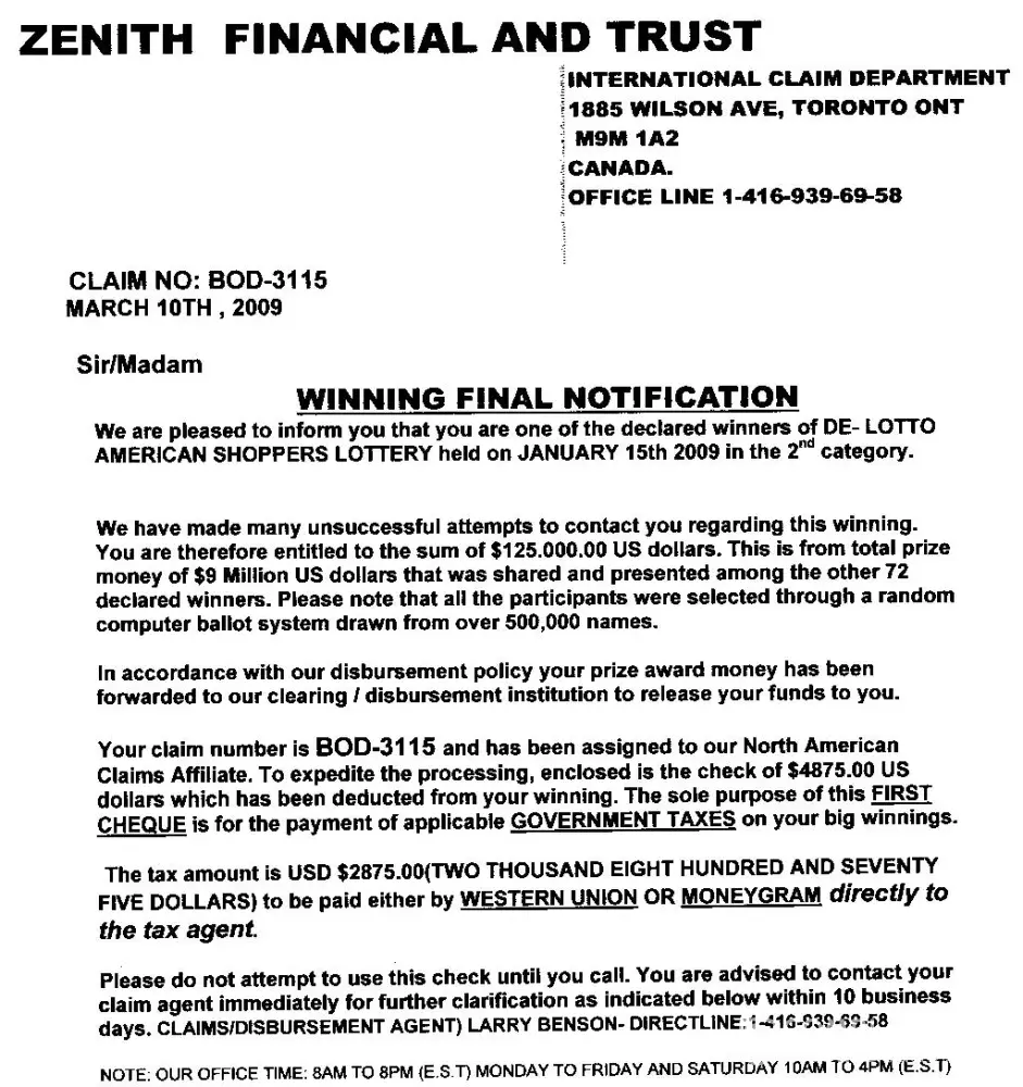 We recentley recieved a check from Zenith Financial And Trust in the amount of $4875.00. Mailed Jan.26, 2009 for a so called drawing held on Nov.25, 2008.I was told to deposite the check, and when it cleared to pay the government taxes by Western Union directley to the tax agent in CANADA! There were never any funds in the account the check was written on, so my bank put a hold on the funds. The Claim/Disbursment Agent LINDA ROBERT said give it a few days, they would be there. I was then given the name, address and phone number of the "Tax Agent" DAVID WILLIAMS(Also in CANADA) He was polite but rather adament about sending the money IMMEDIATELY so I could recieve the remainder of my "Winnings."$120225.00 The check was sent back NO FUNDS AVAILABLE! I am out $7.00 for a returned check fee, but thankfully no more than that. Needless to say this is nothing more than a SCAM! I advise anyone who recieves a letter like this to report it to your local post office as Mail Fraud. They can and will investigate and hopefully help put a stop to LEECHES like this! BE CAREFUL! Yours Helpfully, Jean Nelson