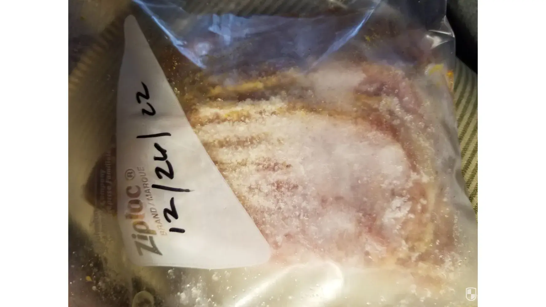 On 12/26/22, I put my leftover Christmas ham in 4 quart size freezer bags and then put those air tight bags into a gallon size ziploc bag and pushed air out for more protection. I got the gallon bag and took out one of my quart bags today and this is what my ham looks like! It hasn't even been a month!