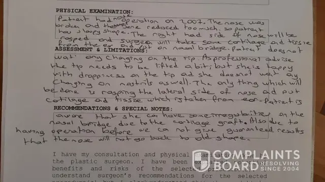 First of all, contrary to what has been stated above, Miss Lisa Hayes did have a major break on her nose to begin with before she had her operation with us which has left her with a fractured bone making her nose bent to one side, this could be evidenced both by the pictures submitted by the patient before she came to have the procedure and the photos taken after her operation during the consultation. We have clearly explained to the patient that the due to level of damage being intense, that we can only obtain a limited improvement for her surgery (all the information given to the patient as to what level of improvement could be offered is highlighted on the consultation form which the patient assented by undersigning it, please see the attached copy), hence; our clinic has complied with its clinical obligations not only by explaining all the possible disadvantages with the operation but at the same time by following on patient's post-op queries on numerous occasions, we have repeated the same on each occasion that the result obtained is the best possible result that could be achieved in view of the previous damage which is beyond repair; however, patient's expectations were clearly registered not to be realistic enough. Regarding the issues about passing blood in stool, it is clearly not clinically proven to be related with the rhinoplasty operation the patient had, there is hardly any condition of such that could be observed with any rhinoplasty operation. Such as the same for the excruciating pain and tiredness; no clinical findings suggested any evidence for these problems to be linked with the operation the patient had.