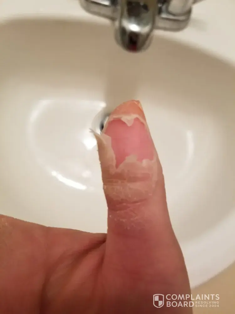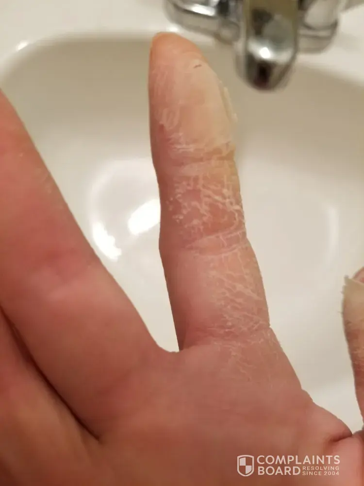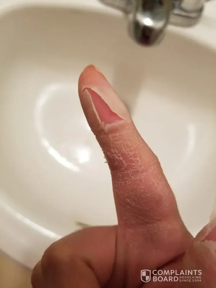 I tired the revlon nail enamel removal "extra gentle" and the product dried my finger skin so hardly that my skin started to stretch and peel off . I already sent an email to the customer service but they haven't responded jet. I have to use a glove at work and home in order to protect my fingers from physical contact because it hurts so much. I'm still waiting for a response