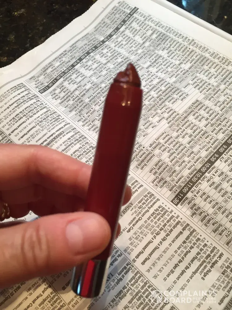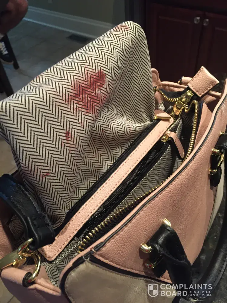 On 7/22/17 I reached into my new handbag's zipped compartment to retrieve the Colorburst Lip Stain to apply to my lips. As soon as I inserted my hand into the pocket it became covered with the product due to an insufficient closure between the cap and the product itself. It left the inside of the handbag stained as well as all other items inside the pocket. (see photo) I was able to wipe the product off of other lipsticks in the compartment but I had to discard a new nail file. I now have to see whether I will be able to clean the mess the Lip Stain has left behind.